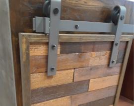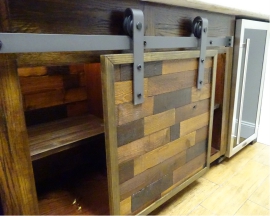 Love the smell of Cedar? You may be more unique than you think... although Cedar is a beautiful wood to use for home projects, some people may have an allergy or low tolerance to certain strong orders such as Cedar. In an effort to ensure everybody's happiness, CMJ-Enterprise applied a special "Sealer" to all surfaces after fabrication and staining of the custom planks. Eliminating the risk of employee and customer sensitivity to the odor of Cedar. The custom rough-cut Cedar planks measured 3/8" thick by 5" high, and varied in length to minimize uniformity. Metal washers were randomly placed under plank ends to bring variation to the "Butt" ends of the planks, creating the illusion of uneven plank thickness. The same wood, pattern, and colors were used when fabricating the Cabinet interior, and cabinet Barn Doors. However, a smaller plank size was used to make the cabinets look in proportion.